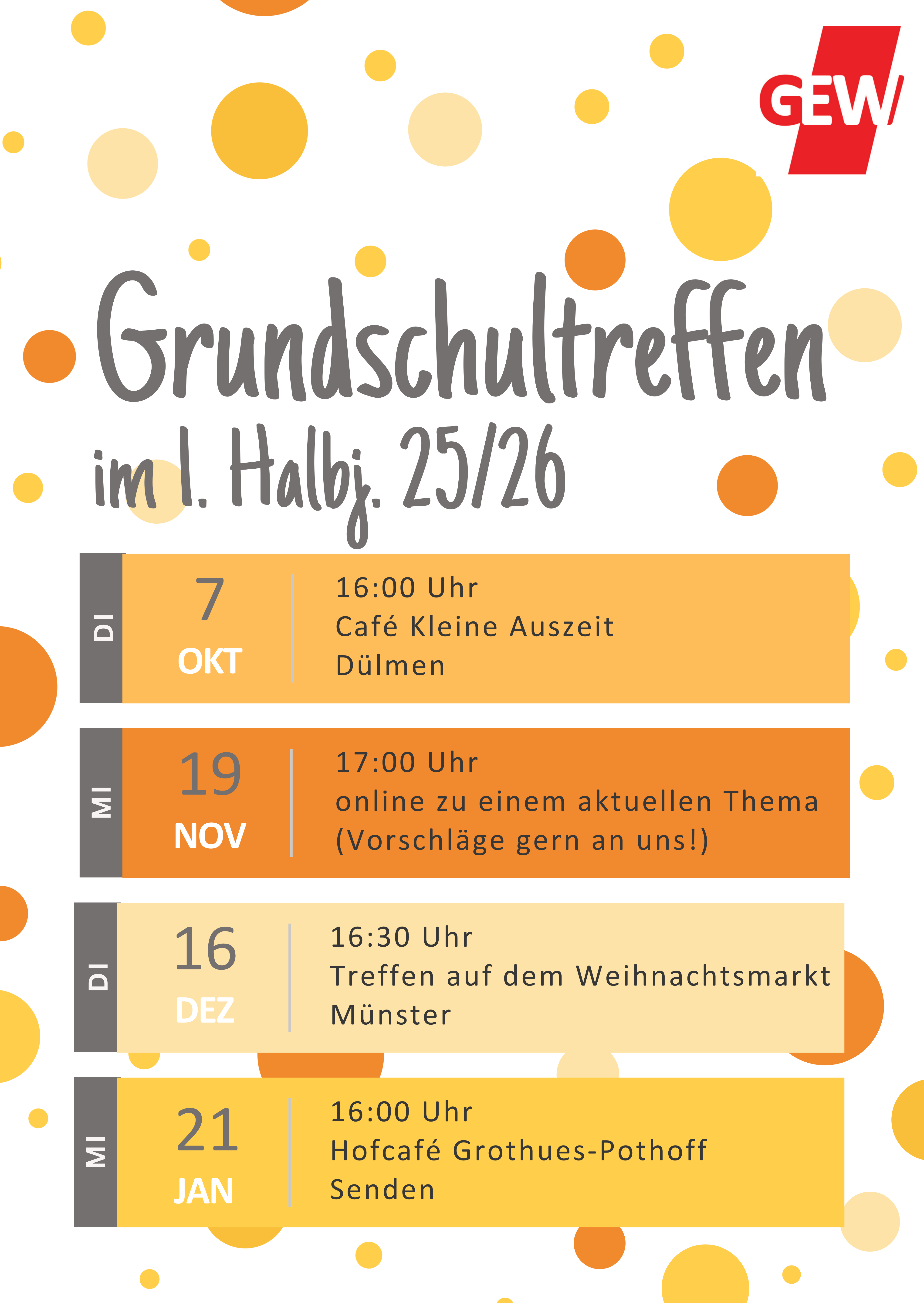 Wir laden dich herzlich zu unseren offenen Grundschultreffen ein! Wir treffen uns in gemütlicher Runde, tauschen Neuigkeiten und neueste Infos aus und machen gemeinsam Pläne für die Gewerkschaftsarbeit vor Ort. Wenn du dich also für Gewerkschaftsarbeit interessierst und/oder mit Personalrätinnen ins Gespräch kommen möchtest, bist du hier genau richtig und herzlich willkommen. Bitte sag uns kurz vorher per Mail an gewcoesfeld@gmail.com Bescheid, wenn du bei einem Treffen dabei sein möchtest.